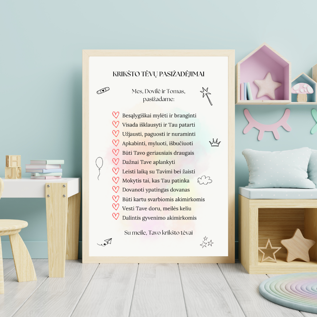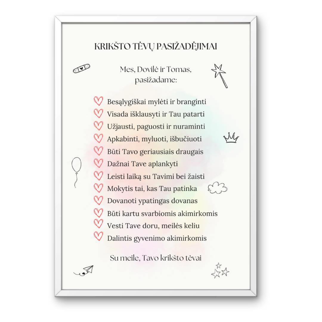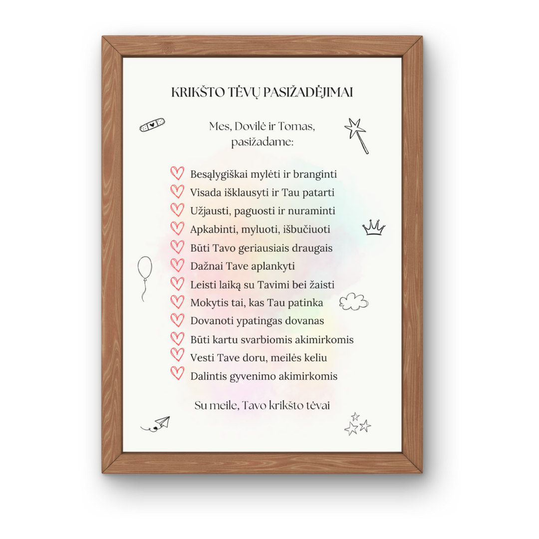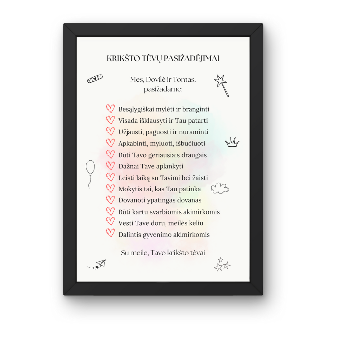 Krikšto tėvų pasižadėjimai, tai puiki dovana ypatingos ir Jūsų vaikui svarbios dienos proga. Tai dovana, kuri visada primins artumą, ryšį, vertybes bei meilę. Šiame paveiksle galite pasirinkti jau sukurtą tekstą arba sugalvoti savitą, būtent tai, ką norite pasižadėti Jūs.